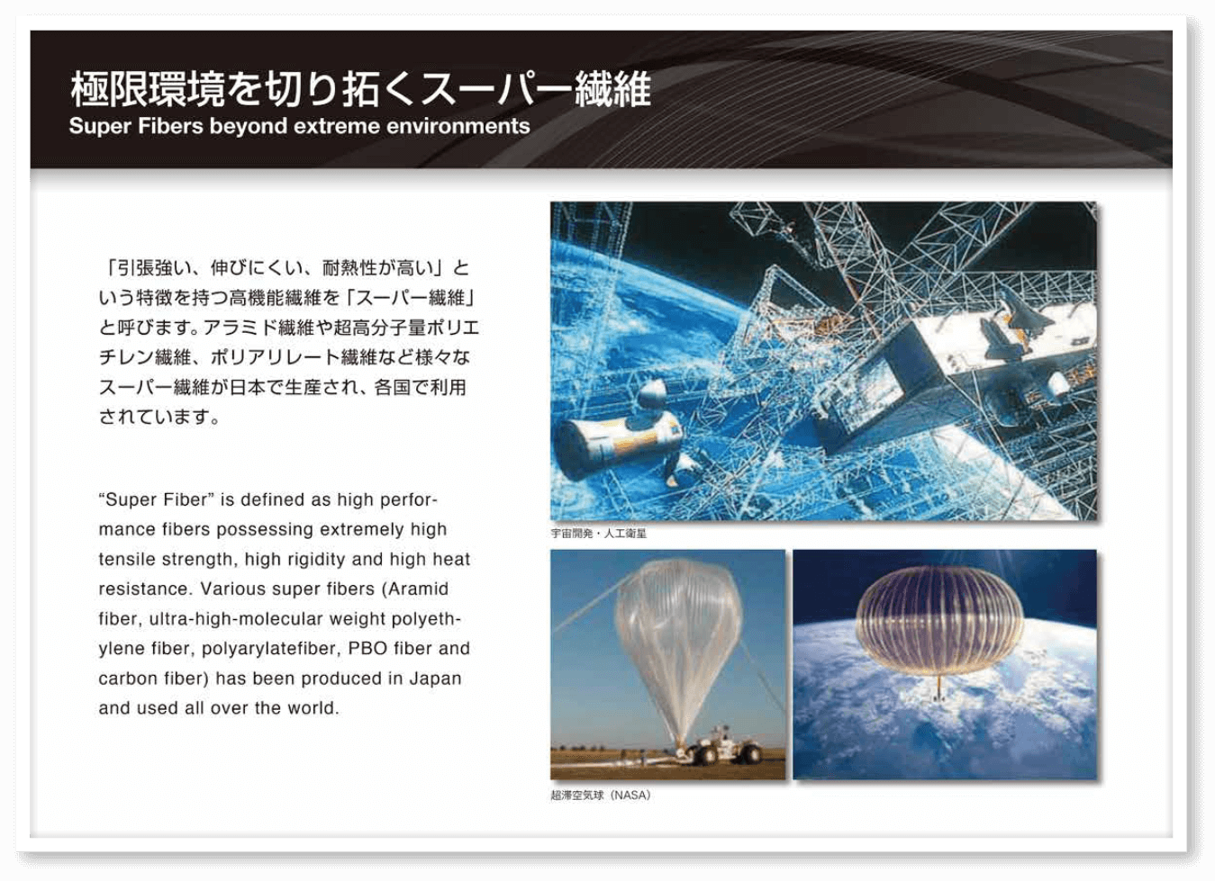 金属より強く、軽く -炭素繊維-Stronger and Lighterthan Metals -Carbon fibers-炭素繊維は、軽さと強さを兼ね備えた材料です。鉄にくらべ比重は1/4で、10倍の比強度があります。しかも、さびず、熱や薬品の影響を受けにくいという特徴があります。またその”しなやかさ”から、カーブ面など様々な形にすることができます。このような優れた性質を活かして強化繊維として航空機や自転車、土木建設など、強さと共に軽さや長期的な安定性が求められる用途に広く使われています。Carbon fiber is the material that is strong and light at the same time. Compared to iron, its specific gravity is 1/4, and its specific strength is ten times. Besides of that, it is free from rusting and durable against heat and chemical influence. Its flexibility allows to be molded into curvy shapes, so it used in many areas which require long-term durability and lightness such as aircrafts, automobiles, and the architecture.金属より強く、軽く -炭素繊維-Stronger and Lighterthan Metals -Carbon fibers-炭素繊維は、軽さと強さを兼ね備えた材料です。鉄にくらべ比重は1/4で、10倍の比強度があります。しかも、さびず、熱や薬品の影響を受けにくいという特徴があります。またその”しなやかさ”から、カーブ面など様々な形にすることができます。このような優れた性質を活かして強化繊維として航空機や自転車、土木建設など、強さと共に軽さや長期的な安定性が求められる用途に広く使われています。Carbon fiber is the material that is strong and light at the same time. Compared to iron, its specific gravity is 1/4, and its specific strength is ten times. Besides of that, it is free from rusting and durable against heat and chemical influence. Its flexibility allows to be molded into curvy shapes, so it used in many areas which require long-term durability and lightness such as aircrafts, automobiles, and the architecture.