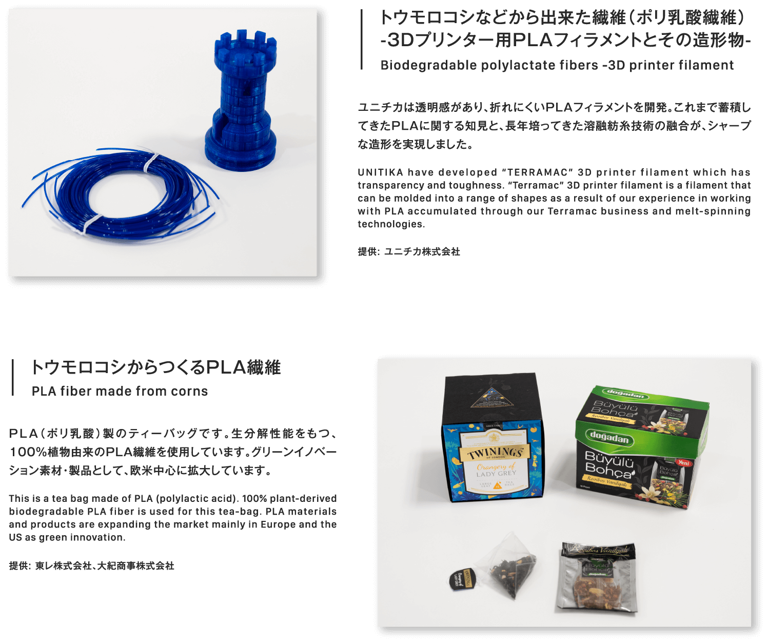トウモロコシなどから出来た繊維(ポリ乳酸繊維)-3Dプリンター用PLAフィラメントとその造形物-Biodegradable polylactate fibers -3D printer filament ユニチカは透明感があり、折れにくいPLAフィラメントを開発。これまで蓄積してきたPLAに関する知見と、長年培ってきた溶融紡糸技術の融合が、シャープな造形を実現しました。UNITIKA have developed “TERRAMAC” 3D printer filament which has transparency and toughness. “Terramac” 3D printer filament is a filament that can be molded into a range of shapes as a result of our experience in working with PLA accumulated through our Terramac business and melt-spinning technologies.提供: ユニチカ株式会社トウモロコシからつくるPLA繊維PLA fiber made from cornsPLA(ポリ乳酸)製のティーバッグです。生分解性能をもつ、100%植物由来のPLA繊維を使用しています。グリーンイノベーション素材・製品として、欧米中心に拡大しています。This is a tea bag made of PLA (polylactic acid). 100% plant-derived biodegradable PLA fiber is used for this tea-bag. PLA materials and products are expanding the market mainly in Europe and the US as green innovation.提供: 東レ株式会社、大紀商事株式会社トウモロコシなどから出来た繊維(ポリ乳酸繊維)-3Dプリンター用PLAフィラメントとその造形物-Biodegradable polylactate fibers -3D printer filament ユニチカは透明感があり、折れにくいPLAフィラメントを開発。これまで蓄積してきたPLAに関する知見と、長年培ってきた溶融紡糸技術の融合が、シャープな造形を実現しました。UNITIKA have developed “TERRAMAC” 3D printer filament which has transparency and toughness. “Terramac” 3D printer filament is a filament that can be molded into a range of shapes as a result of our experience in working with PLA accumulated through our Terramac business and melt-spinning technologies.提供: ユニチカ株式会社トウモロコシからつくるPLA繊維PLA fiber made from cornsPLA(ポリ乳酸)製のティーバッグです。生分解性能をもつ、100%植物由来のPLA繊維を使用しています。グリーンイノベーション素材・製品として、欧米中心に拡大しています。This is a tea bag made of PLA (polylactic acid). 100% plant-derived biodegradable PLA fiber is used for this tea-bag. PLA materials and products are expanding the market mainly in Europe and the US as green innovation.提供: 東レ株式会社、大紀商事株式会社