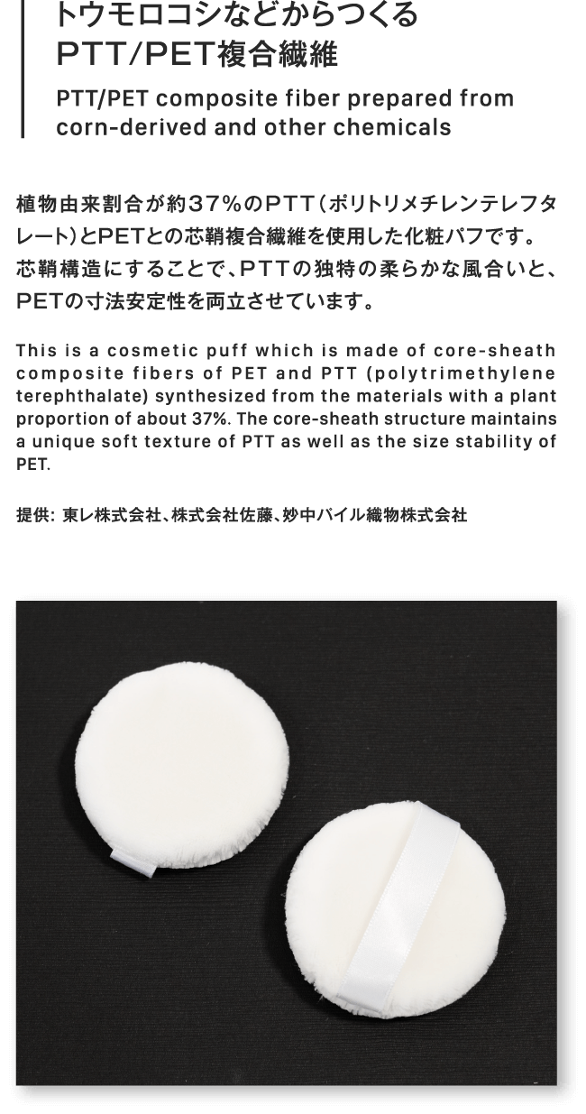 トウモロコシなどからつくるPTT/PET複合繊維PTT/PET composite fiber prepared fromcorn-derived and other chemicals植物由来割合が約37%のPTT(ポリトリメチレンテレフタレート)とPETとの芯鞘複合繊維を使用した化粧パフです。芯鞘構造にすることで、PTTの独特の柔らかな風合いと、PETの寸法安定性を両立させています。This is a cosmetic puff which is made of core-sheath composite fibers of PET and PTT (polytrimethylene terephthalate) synthesized from the materials with a plant proportion of about 37%. The core-sheath structure maintains a unique soft texture of PTT as well as the size stability of PET.提供: 東レ株式会社、株式会社佐藤、妙中パイル織物株式会社トウモロコシなどからつくるPTT/PET複合繊維PTT/PET composite fiber prepared fromcorn-derived and other chemicals植物由来割合が約37%のPTT(ポリトリメチレンテレフタレート)とPETとの芯鞘複合繊維を使用した化粧パフです。芯鞘構造にすることで、PTTの独特の柔らかな風合いと、PETの寸法安定性を両立させています。This is a cosmetic puff which is made of core-sheath composite fibers of PET and PTT (polytrimethylene terephthalate) synthesized from the materials with a plant proportion of about 37%. The core-sheath structure maintains a unique soft texture of PTT as well as the size stability of PET.提供: 東レ株式会社、株式会社佐藤、妙中パイル織物株式会社